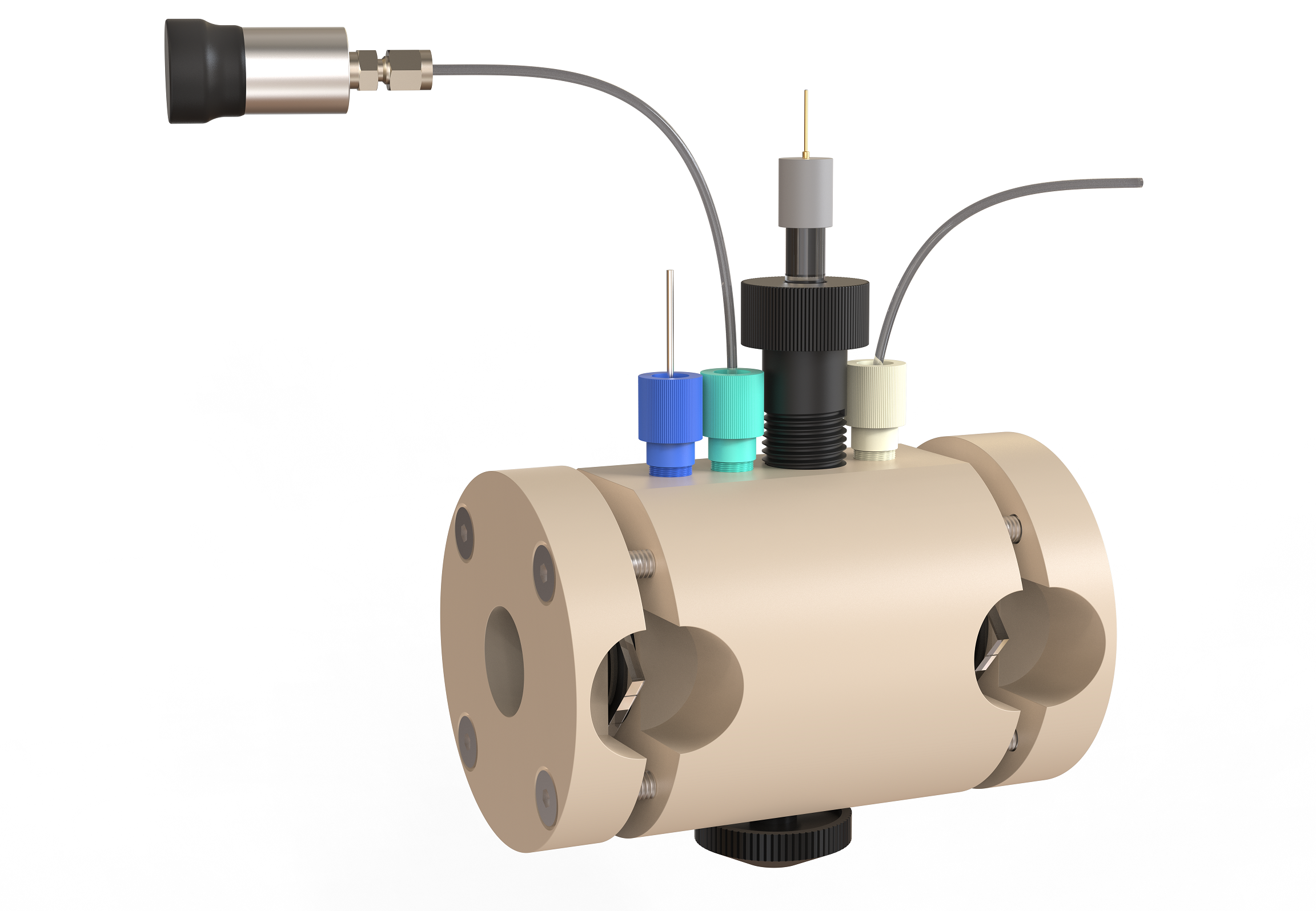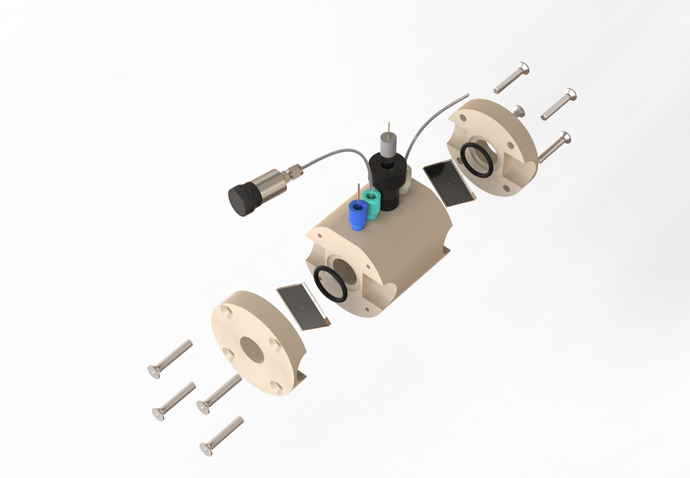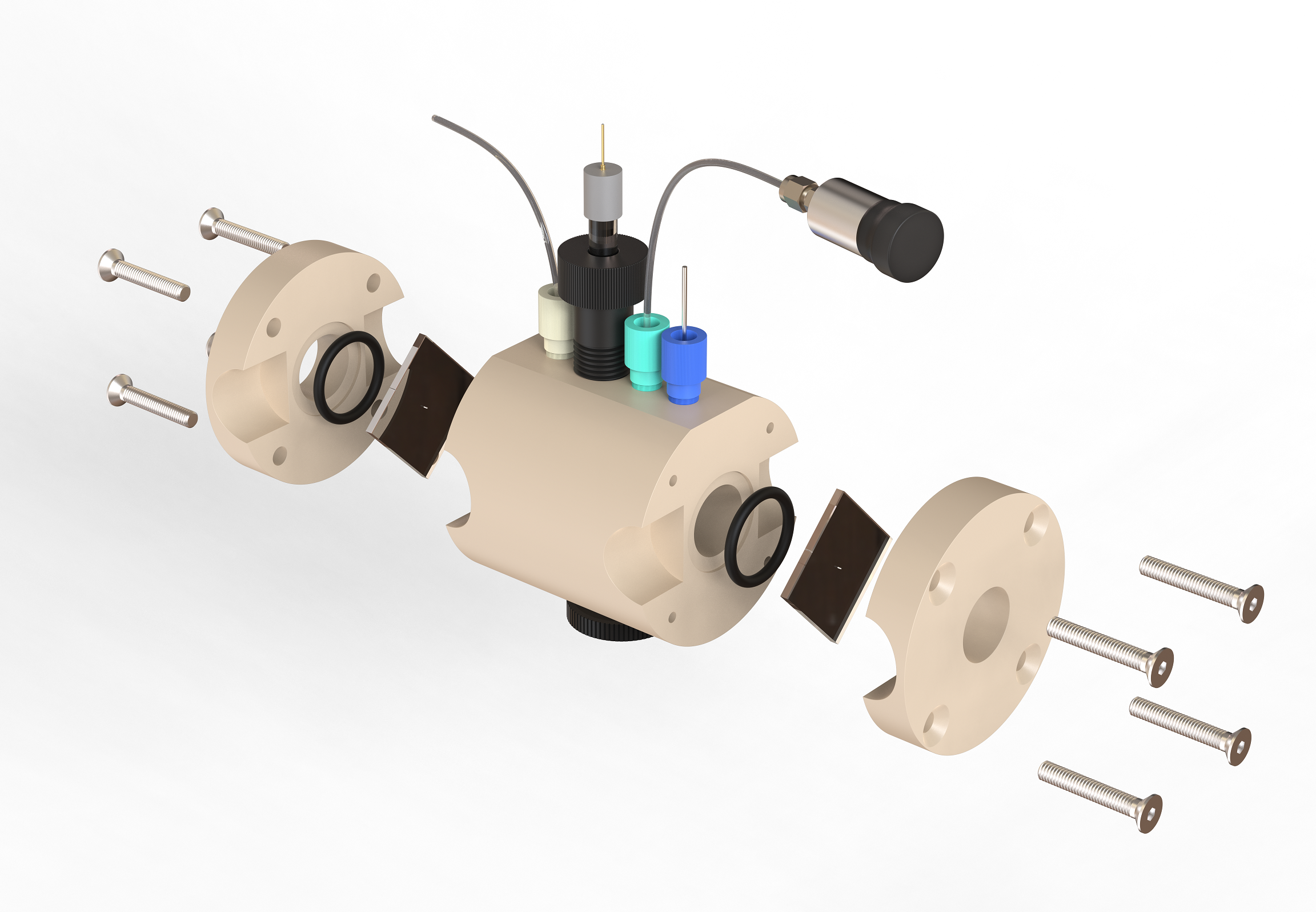 Horizontally mounted and height adjustable double-sided photo electrochemical cell for the investigation of thin-film photoanode and photocathode. This setup allows you to perform measurements in 2- or 3- electrode system. Cell design, volume, number of sides and compartments can be customized based on your own research.