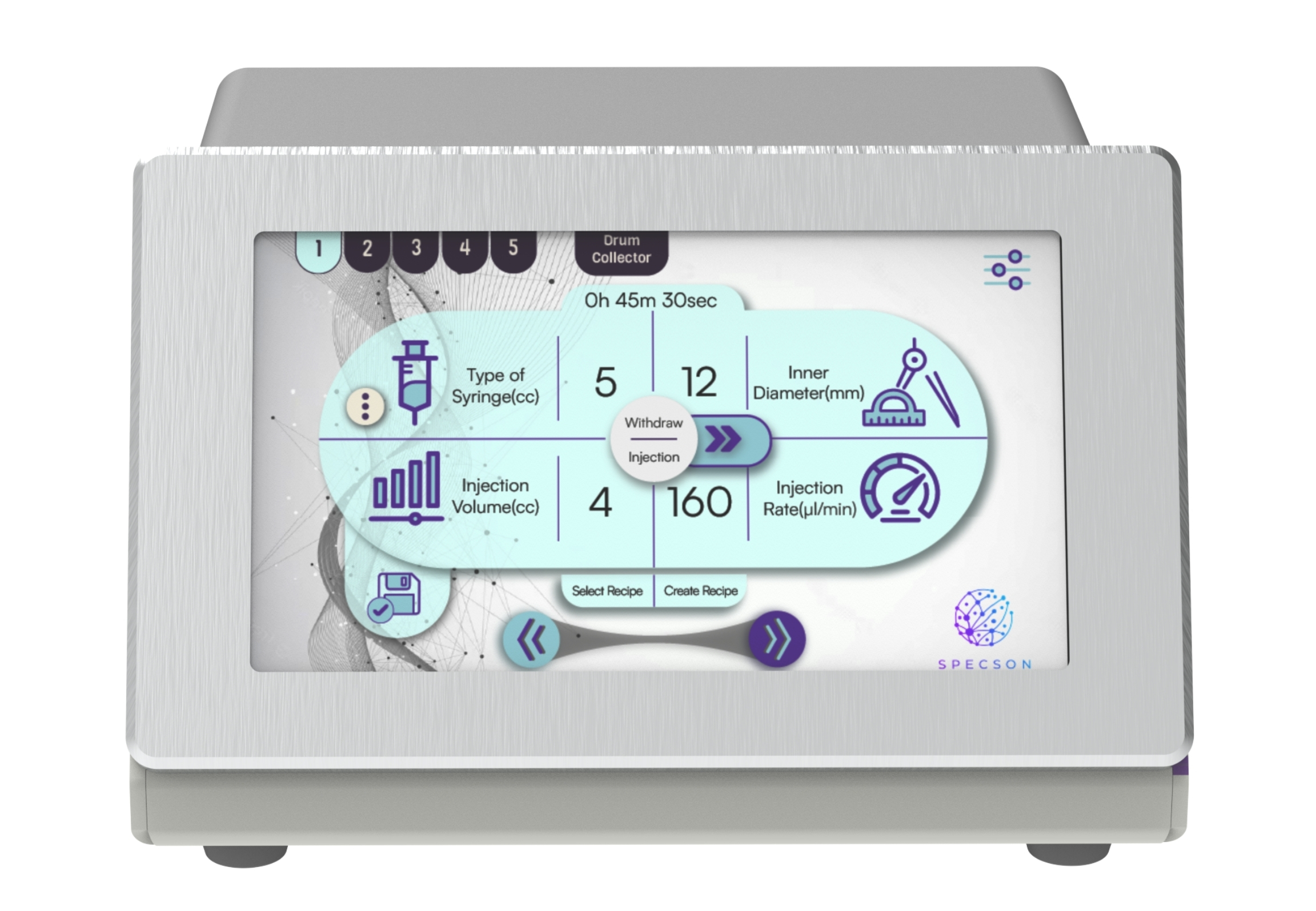Syringe Pump Specson 100-MC is a modular injection pump with an external control unit. Users can add up to 7 independent channels with individual control. Control unit comes with 7’’ capacitive touch screen and user friendly interface. Users can easily set infinite number of injection/withdraw steps by using advanced recipe management system. All parts are made out of CNC machined 6061 aluminum.